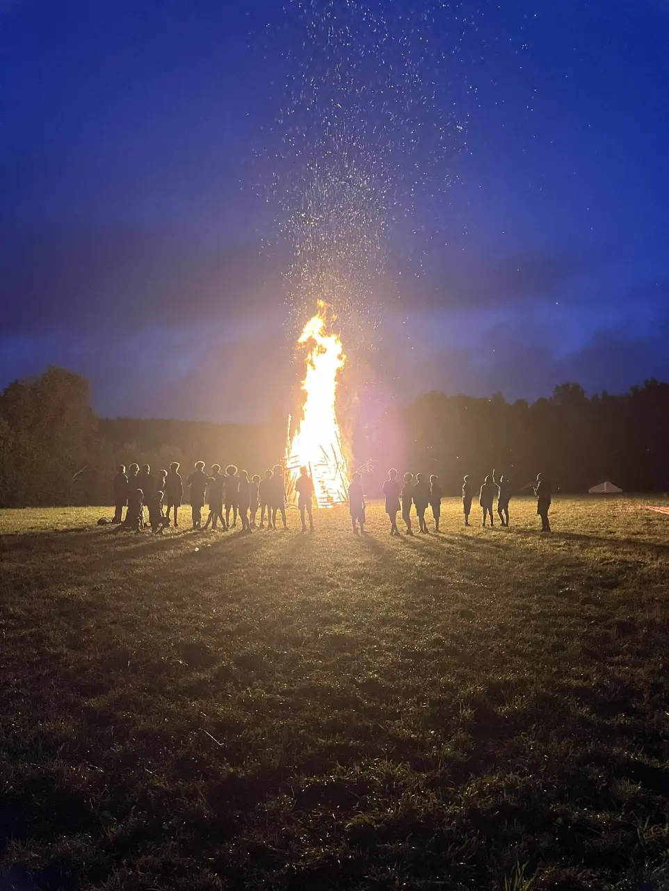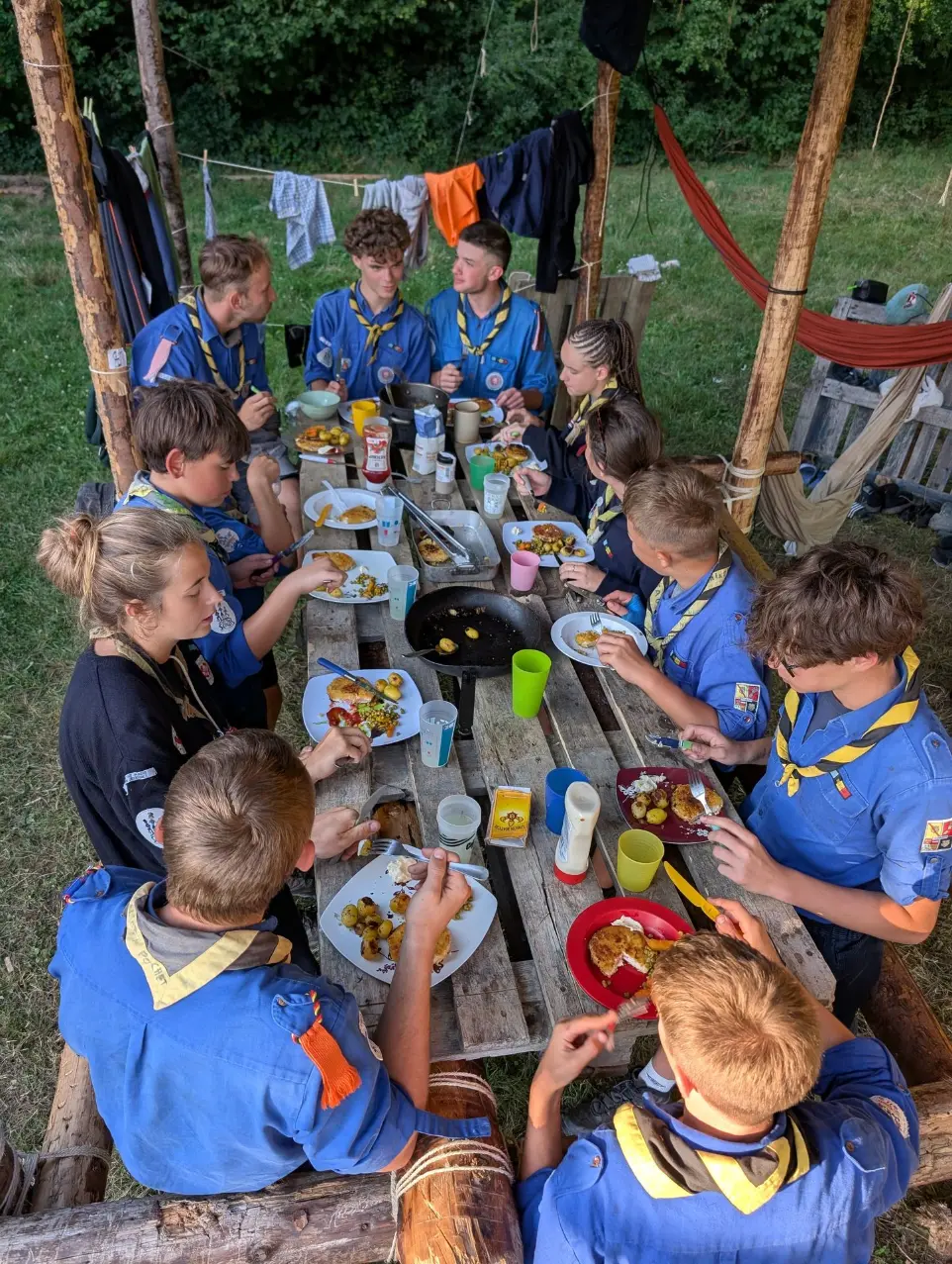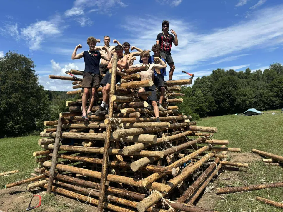 Le point d’orgue de l’année ? Un grand camp de 15 jours en prairie fin juillet, où l’on vit en patrouilles, où l’on construit ses propres installations en bois (dont les fameux pilotis 🪵), et avec des grands jeux.